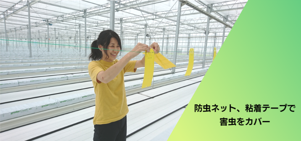 万が一、侵入してきても黄色い粘着テープをハウス中に設置しているので、農薬散布回数を減らすことができます。